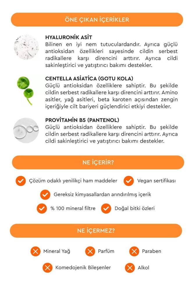 % 100 mineral filtreler ile UVA-UVB ışınlarına karşı geniş spektrumlu koruma sağlar. Doku: Yağlı ve yapışkan bir his bırakmaz. İlk kullanımda geçiçi beyazlık bırakır, birkaç dakika içerisinde cilt tarafından emilir ve beyazlık kalmaz. PA++++: UVA ışınlarına karşı 8 saat ve üzeri koruma sağlar. Avantajlar: Tüm cilt tiplerinin kullanımına uygunluğu dermatolojik olarak test edilmiştir.; % 100 mineral filtreler içerdiği için hamile ve emziren anneler için güvenli koruma sağlar.; Suya Dayanıklıdır.; Göz çevresinde kullanımı uygundur.; Komedojenik bileşen, paraben, silikon, kimyasal filtreler içermez.; Parfüm içermez. ;