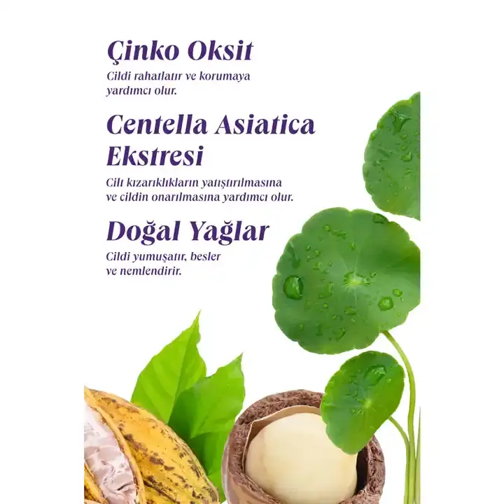 Doğal Yağlar : Kakao ve shea yağları ile zeytinyağı sayesinde cildi yumuşatır; derinlemesine besler ve pürüzsüz doku sağlar.
