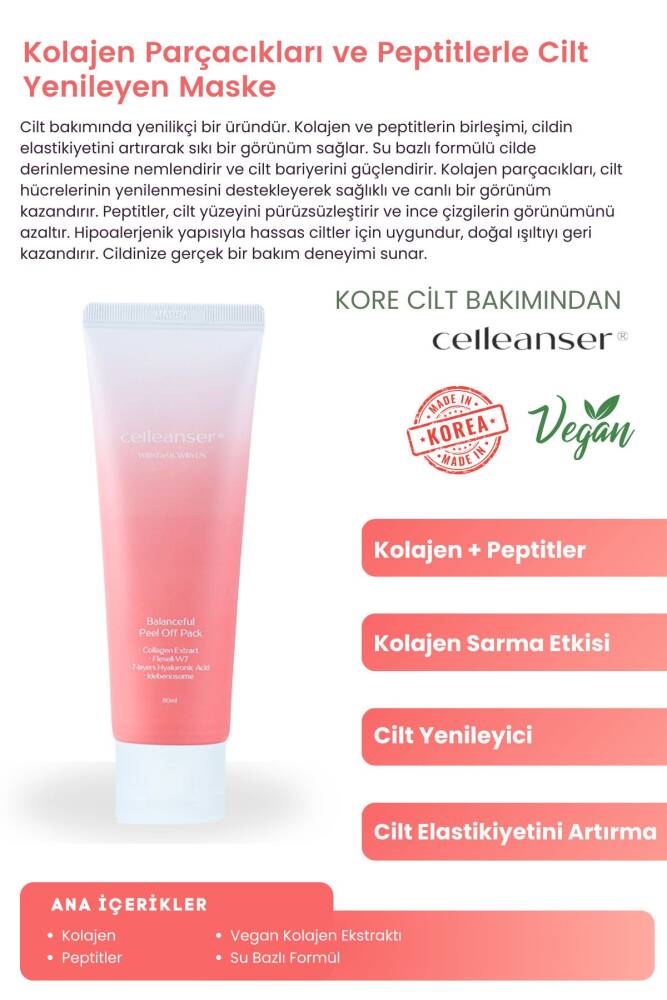 Bu hafif yapılı soyulabilir maske, cildinizi yeniler ve pürüzsüz bir cilt tonu sunar.; Hipoalerjenik Test Edilmiş:Hassas ciltler için uygun.; ; İçerik Zenginliği:Panthenol ve 7 çeşit hyaluronik asit içerir.; ; İdebenozom Desteği:Cilt dokusunu iyileştirir, cilt tonunu eşitler.; ; Nazik Temizleme:Cilt yüzeyindeki ölü hücreleri nazikçe temizler.; ; Kullanım:Haftada 1-2 kez, temiz cilde uygulayıp tamamen kuruduktan sonra soyun.; ;