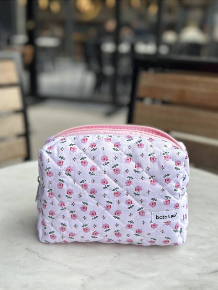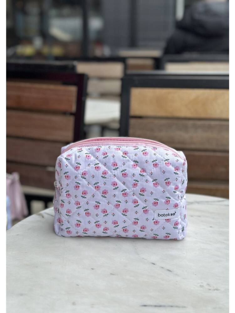 Minik Pembe Çiçek Desenli Makyaj Çantası - Büyük Boy