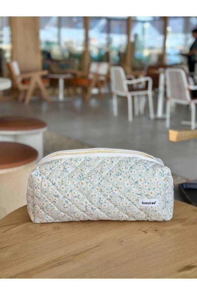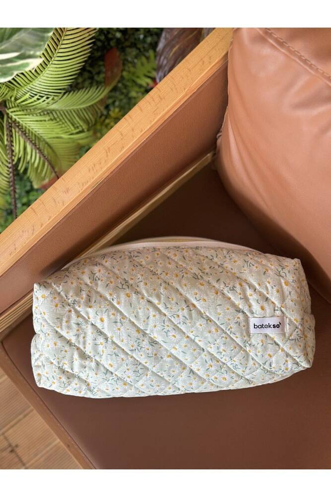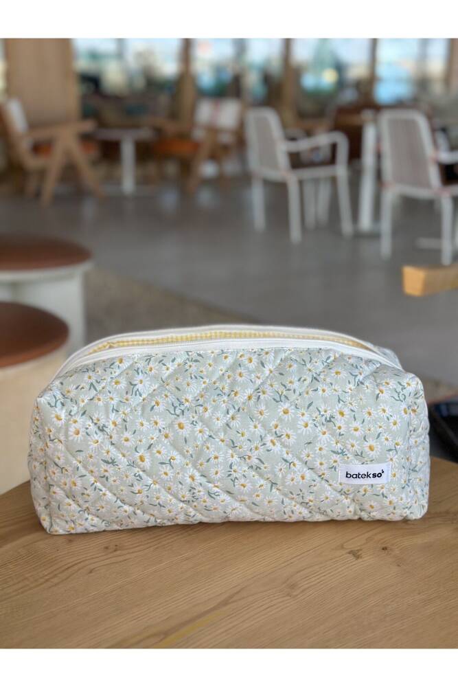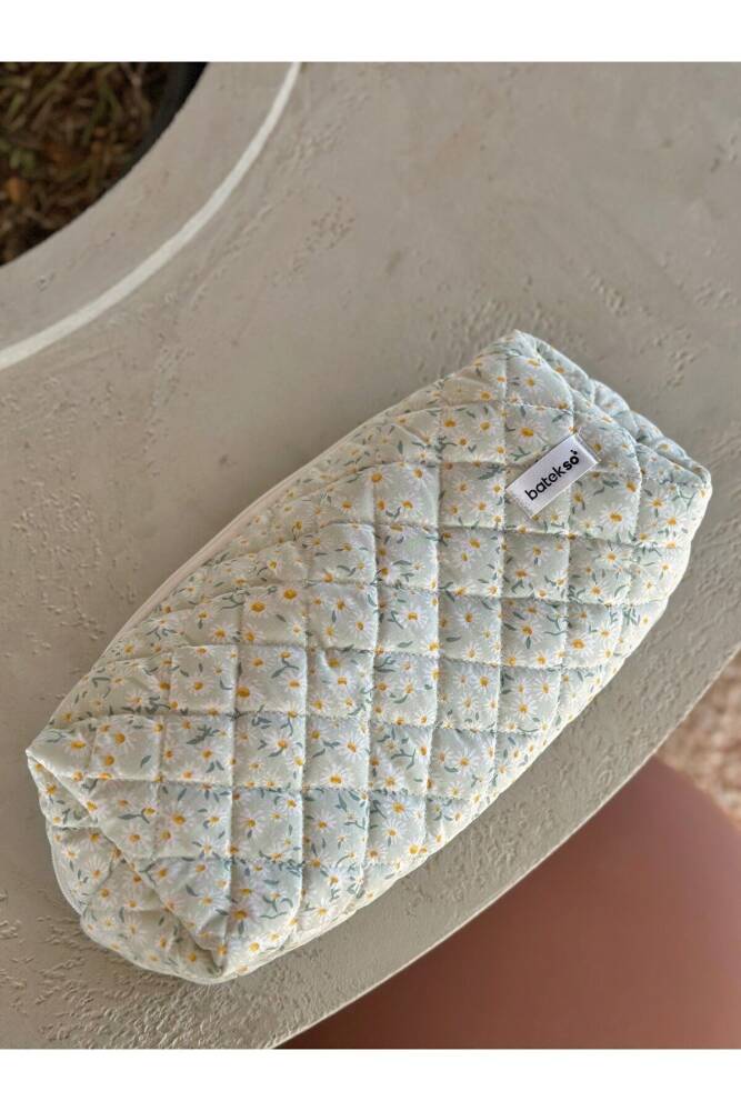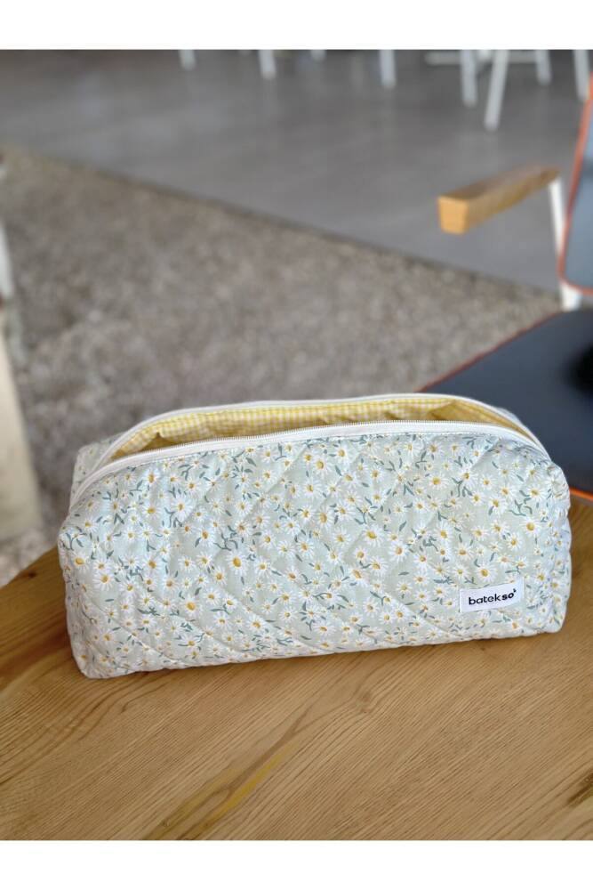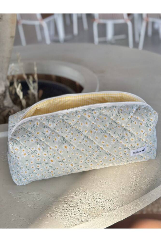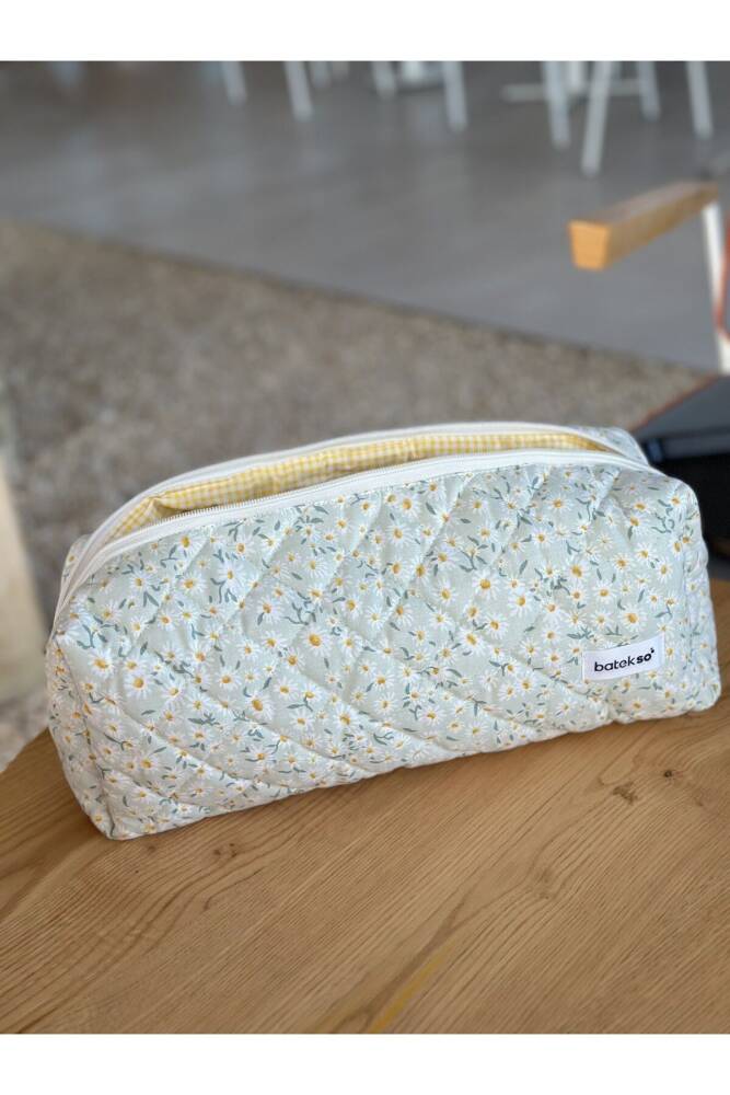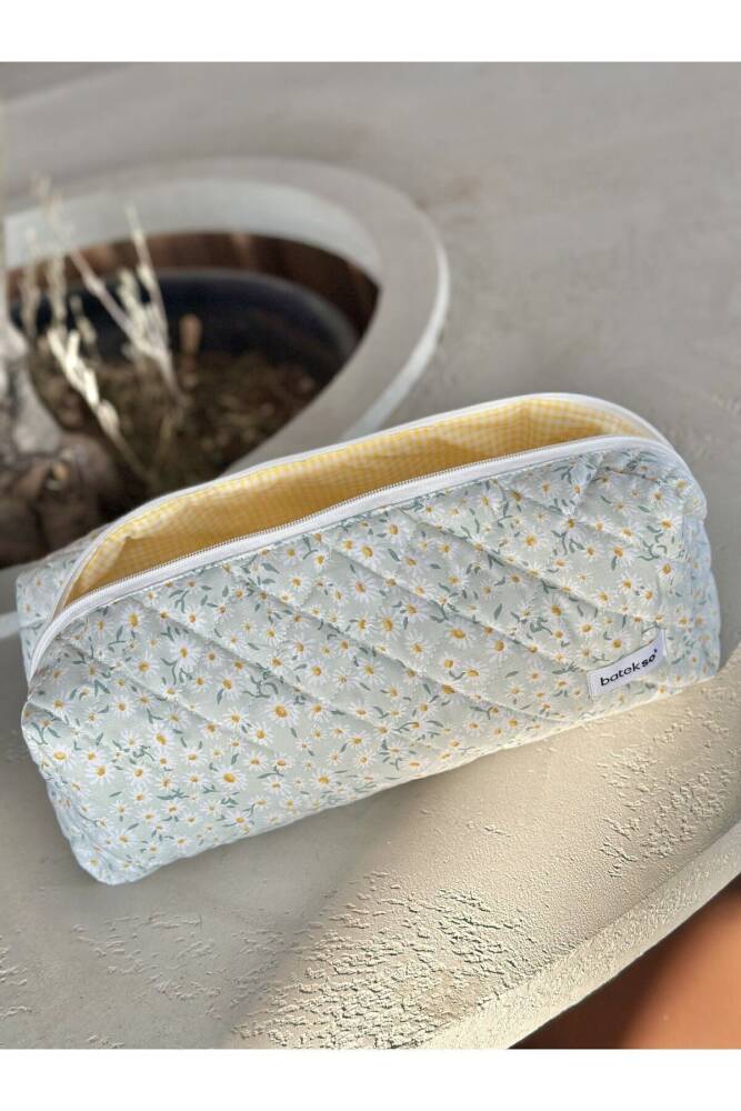 Beyaz Papatya Desenli Saç Şekillendiricileri İçin Seyahat Çantası çok amaçlı kullanımı mevcuttur. ÖLÇÜLERİ 38x12x14'dür. %100 pamuktur. 30 C°'de yıkanabilir. Leke çıkarıcı ve çamaşır suyu kullanılmamalıdır. ;