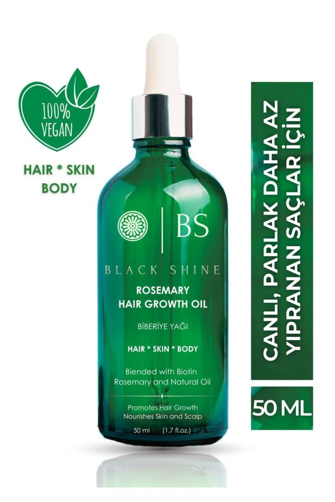 Black Shine Biberiye Yağı Saç Dökülmesi ve Yıpranmış Saçlar için Hızlı Saç Uzatan Biotinli Saç Bakım Complexi Biberiye Yağı mucizesi ile Biotin in eşsiz uyumu. ; Doğal Yağlar ile Daha Güçlü Formüllü Cilt ve Saç Bakımı ; Biberiye yağı, doğal ve vegan içeriğiyle saç, cilt ve vücut için yararlı olan güçlü bir bitkisel karışımdır. Saç derisindeki hücrelerde kan dolaşımını uyarmaya yardımcı olur , saç uzamasını hızlandırmaya ve dökülmeleri önlemeye yardımcı olur. Aynı zamanda saç uzamasına katkı sağlar. Saç derisindeki kepeklenme, kuruluk ve pullanma gibi sorunları çözer ve saçların daha sağlıklı olmasını destekler. ; Biberiye yağı, Kaşlarınızın daha dolgun, kirpiklerinizin ise daha uzun olmasına yardımcı olur. Formülündeki bileşenler ile kaş ve kirpik bakımınızı da sağlar. Aynı zamanda kuru cildi nemlendirme özelliğine de sahiptir. ; Biberiye Yağı (Rosemary Oil):Biberiye bitkisinin çiçeklerinden ve yapraklarından elde edilen uçucu bir yağdır. Antioksidan ve anti enflamatuar özelliklere sahip birçok bileşen içerir. ; Hint Yağı: Sütlegengiller familyasından bir bitki türüdür. Hem saç hem cilt için yenileyici ve onarıcı etkileri vardır. ; Biotin: Deri altı doku oluşumunu ve yenilenmesini destekler. Saç, tırnak ve cilt sağlığı için önemli bir vitamindir. ; Nane Yağı:Naneden elde edilen esansiyel bir yağdır. Cilde ışıltı ve aydınlık verir, saç ve saç derisini nemlendirme özelliğine sahiptir. ; Kullanım Şekli: Birkaç damla biberiye yağını saç derisine uygulayın ve hafifçe masaj yaparak saç uçlarına kadar yayın. Saçınızda 1 saat beklettikten sonra saçınızı durulayın. Ayrıca kutunun içinden çıkan fırça yardımıyla kaş ve kirpiklerinize bakım yapabilirsiniz. Gün aşırı kullanım önerilmektedir. ;