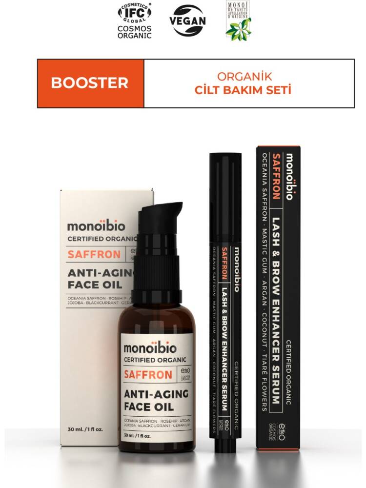 SERTİFİKALAR;? IFC- Cosmos Organic;? Vegan;SET İÇERİĞİ;? Saffron Anti Aging Face Oil 30 ml;? Saffron Lash & Brow Enhancer Serum 2.8 ml;GÜVENİLİR İÇERİK;? SLS içermez;? Paraben içermez;? Hayvanlar üzerinde denenmemiştir;CİLT TİPİ;? Tüm cilt tipleri için uygundur.