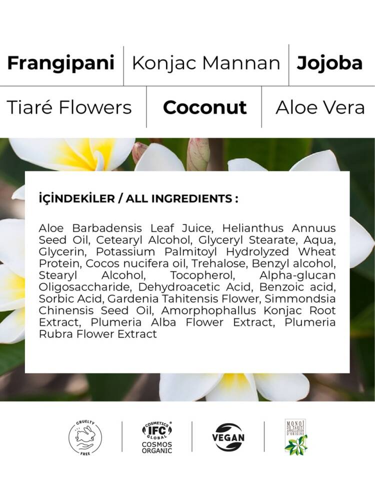 Ürün Açıklaması Sertifikalar IFC - Cosmos Organic ; Vegan ; Monoï de Tahiti Appellation d'Origine ; Özel İçerikler Konjac Mannan ; Frangipani ; Tiaré Çiçekleri ; Jojoba ; Hindistan Cevizi ; Aloe Vera ; Faydaları Özel formülasyonu hem yüz hem de göz çevresi için kullanıma uygundur.; ; Cildi yormadan, makyaj kalıntılarından kolayca arınmasını sağlar.; ; Kullanımı Göz için Kullanım: Pamuk ıslatılır, ardından pamukta kalan fazla su sıkılır.; ; Nemli pamuğa bir miktar ürün alınır ve pamuk göz kapağına kapatılır.; ; 60 saniye bekledikten sonra göz çevresi yumuşakça silinerek göz makyajı kolayca temizlenir.; ; Yüz için Kullanım: Avuç içine 2 pompa ürün alınır.; ; El içinde ürün ısıtılır.; ; Yumuşakça dairesel hareketlerle yüze sürülür ve hafifçe masaj yapılır.; ; Kuru pamukla cilt silinerek temizlenir.; ; Güvenilir İçerik SLS içermez.; ; Paraben içermez.; ; Hayvanlar üzerinde denenmemiştir.; ; Cilt Tipi Tüm cilt tipleri için uygundur.; ; Boyut 250 ml ;