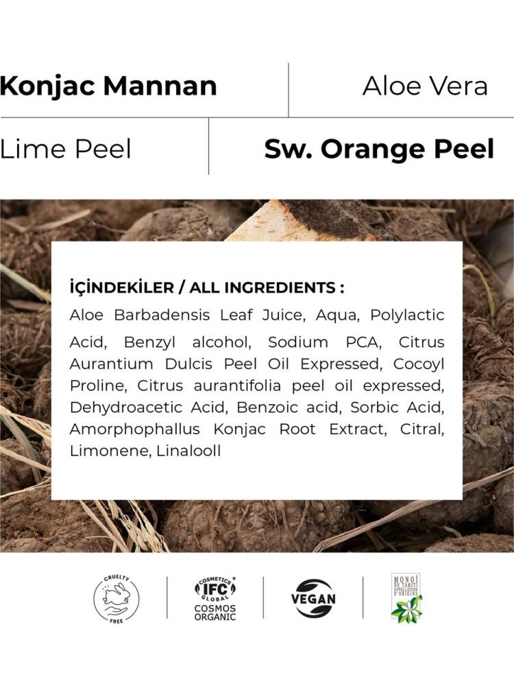 SERTİFİKALAR IFC- Cosmos Organic ; Vegan ; ÖZEL İÇERİKLER: Konjac Mannan ; Sw.; Orange Peel ; Lime Peel ; Aloe Vera ; FAYDALARI İçerisindeki Aloe Vera yumuşakça ölü hücrelerin ciltten atılmasını sağlar.; ; Cildin nemlenmesini sağlar.; ; Konjac Bitki Lifleri ciltte nemi koruyucu bir film tabakası oluşturur.; ; Dokusundaki yumuşak granülleri sayesinde cildi tahriş etmeden ölü hücrelerden arındırır.; ; Ciltte homojen bir temizlik sağlayarak leke oluşumunu engeller.; ; Kremlerin daha iyi nüfuz etmesini sağlayarak aktif içeriklerin emilimini artırır.; ; Ciltte Anti-Ageing etkisi yaratır.; ; KULLANIMI Haftada 1-2 defa banyo sonrası bir fındık büyüklüğünde ürün ile göz çevresi hariç yüzün tamamı dairesel hareketlerle 2-3 dakika boyunca masaj yapılarak ölü derilerden arındırılır ve ardından su ile durulanır.; Peeling yüzde kalmamalıdır; GÜVENİLİR İÇERİK SLS içermez; ? Paraben içermez; ? Hayvanlar üzerinde denenmemiştir; CİLT TİPİ ? Tüm cilt tipleri için uygundur; BOYUT ? 100 ml