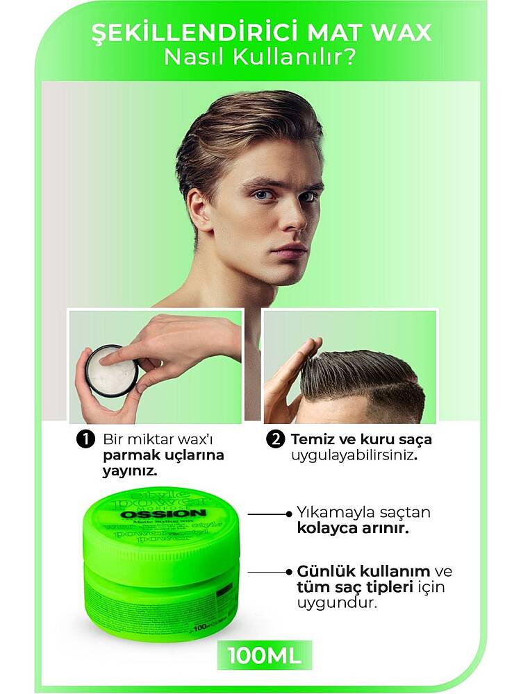 Yıkamayla kolay arınabilen saç waxı mat bir efekt vermek için dizayn edilmiştir. Şekil verirken farklı tarz ve stilleri takip ediniz. Ossion Profesyonel Şekillendirici Mat Wax ile yaratıcı doku ve stiller yaratınız. Dağınık bir stil için sezgilerinizi takip ediniz ve her zaman hayal etiğiniz şekilde şekillendiriniz.