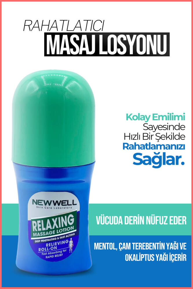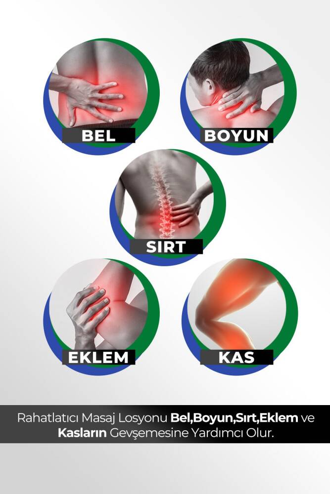Rahatlatıcı Masaj Losyonu 50 ML İçeriğindeki menthol, çam terebentin yağı ve okaliptus yağı ile uyguladığınız bölgede ferahlama sağlar. ; Kullanımı: Ürünü vücut bölgenize, roll-on başlığı yardımı ile masaj hareketleri yaparak sürün. ; Durulamaya gerek yoktur. ; Yüz bölgesine uygulamaktan kaçının. ; Uyarılar: Haricen kullanılır. ; Gözle temasından kaçınınız. ; Temas halinde bol su ile yıkayınız. ; Oda sıcaklığında saklayınız. ; Çocukların ulaşamayacağı yerde ve kendi ambalajında saklayınız. ; 3 yaş altı çocuklar için kullanılmamalıdır. ; Tahriş olmuş cilde uygulamayınız. ; Kullanmaya başlamadan önce cildinize uygulayacağınız bölgede küçük bir yere kullanma talimatına uygun olarak, cildinizin rekasiyonunu kontrol ediniz. ; Herhangi bir kızarıklık, yanma, kabarma veya tahriş görülürse ürünü kullanmayınız. ; Beklenmeyen bir yan etki ve tahriş olması durumunda ürünü kullanmayı bırakınız ve dermatoloğunuzu başvurunuz.;