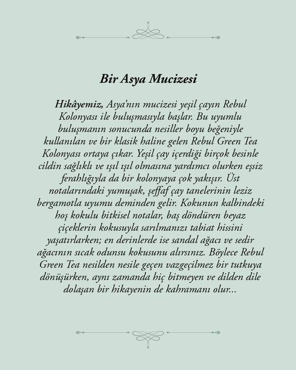 Rebul’un köklü kolonya geleneğiyle modern koku trendlerini birleştiren REBUL GREEN TEA, cildinizde yumuşak bir dokunuş bırakırken, dinginlik ve tazeliği bir arada sunar. Günlük stilinizi tamamlayacak zarif tasarımıyla çantanızda ya da evinizde kolayca taşıyabilir, her anınızda yenilenmenin keyfini çıkarabilirsiniz. Kendinizi bu eşsiz yeşil çay ferahlığına bırakın!