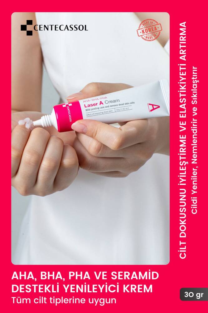 CENTECASSOL AHA-BHA-PHA KREM 30 ML NEDİR? NE İŞE YARAR? ; Akne, komedon, siyah nokta gibi problemlerde kullanılabilen peeling görevi gören bir derma kremdir.; ; Ölü cilt hücreleriyle ilgili endişelerden kurtulmak için AHA BHA PHA krem cilt yüzeyinin eksfoliasyonu için AHA içerir.; ; Aha asidi olan Glikolik Asit tam 14.000 PPM bulunur.; Ölü cilt hücrelerini eritir ve pürüzsüz bir cilt dokusu için nemlendirici bir tabaka oluşturur.; ; Gözeneklerinizdeki derin sebuma etki eden BHA yani Salisilik asit ise Tıkanmış gözenekleri kaplayan sebumu ve hatta gözeneklerdeki atıkları giderir.; Gözenekleri birleştiren eski sebum BHA bileşenlerinin neden olduğu cilt sorunlarını etkili bir şekilde çözer.; ; Son olarak içinde bulunan PHA ise nazik bir şekilde cildi soyar.; Aynı zamanda Peeling sonrası gerekli Sakinleştirici ve Nemlendirici içerikler barındırır.; ; Bu içerikler Hyaluronik Asit, Seramid Ve cilt elastikiyeti için gerekli patentli içerik bulunur.; ; Cilde peeling yaparken cildin neminin ve bariyerin korunmasını sağlar.; ; Kullanım Talimatı: Herhangi bir anormal semptom veya kırmızı lekeler, şişlik gibi yan etkiler varsa bir uzmana danışın.; Çocukların erişemeyeceği, güneş ışığından uzak serin ve kuru yerde muhafaza ediniz.; Gözle temasından sakınınız.; Gözle teması halinde bol su ile yıkayınız.; Kullanım amacı dışında hiçbir maksatla kullanmayınız.; Skt: 14.12.2026