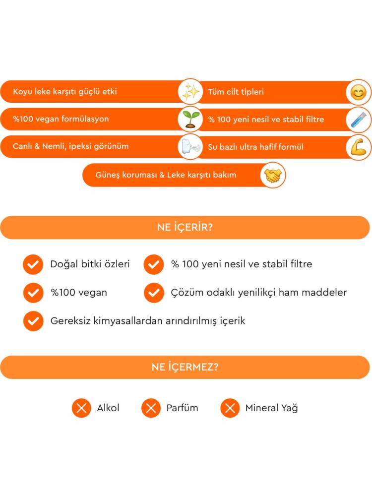 - Arbutin, Niacinamide, Pirinç Özü ve Meyan Kökü katkısıyla leke karşıtı bakımı desteklerken, E vitamini ve Provitamin B5 katkısıyla cildin nem dengesinin korunmasına yardımcı olur.