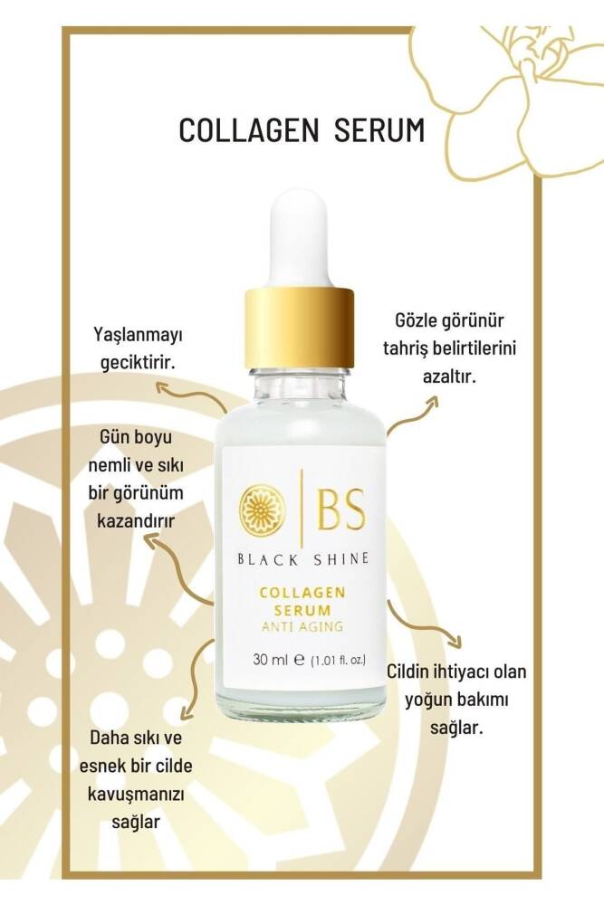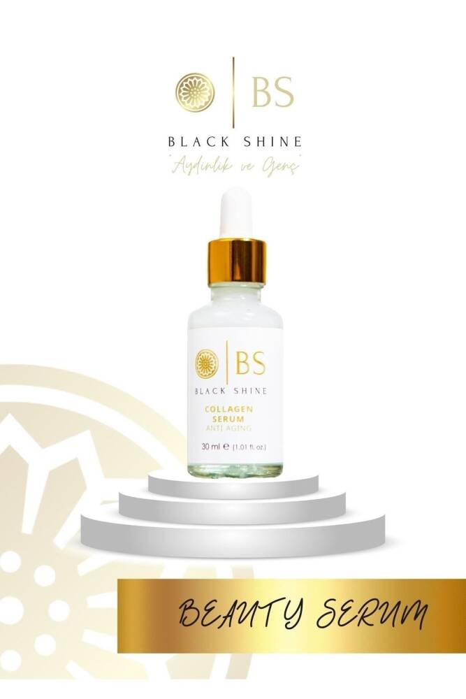 Black Shine Kolajen Serum 30 ml; Yoğun kolajen içeriğiyle gözle görülür tahriş belirtilerini azaltmaya yardımcı olur,; Cildin yenilenmesini destekler, kırışıklık görünümünü azaltmaya, yeni kırışıklıkların ve sarkmaların oluşmasını önlemeye yardımcı olur ,; Yaşlanma karşıtı özel formülü ile , cildinize gün boyu nemli ve sıkı bir görünüm kazandırır,; Cildin ihtiyacı olan yoğun bakımı sağlar,; Düzenli kullanımda sağlıklı ve tazelenmiş bir cilde kavuşmanıza yardım eder,; Gözenek sıkılaştıran etkin formülü ile ve siyah nokta oluşumunu engeller, Tüm cilt tipleri için uygundur; Kullanım Şekli: Temiz cildinize damlalık yardımı ile aldığınız serumu yumuşak hareketlerle masaj yaparak uygulayınız; güneş ışığından uzak tutunuz; Serin ve kuru yerde muhafaza ediniz; Çocukların ulaşamayacağı yerde ve kendi ambalajı içerisinde saklayınız;
