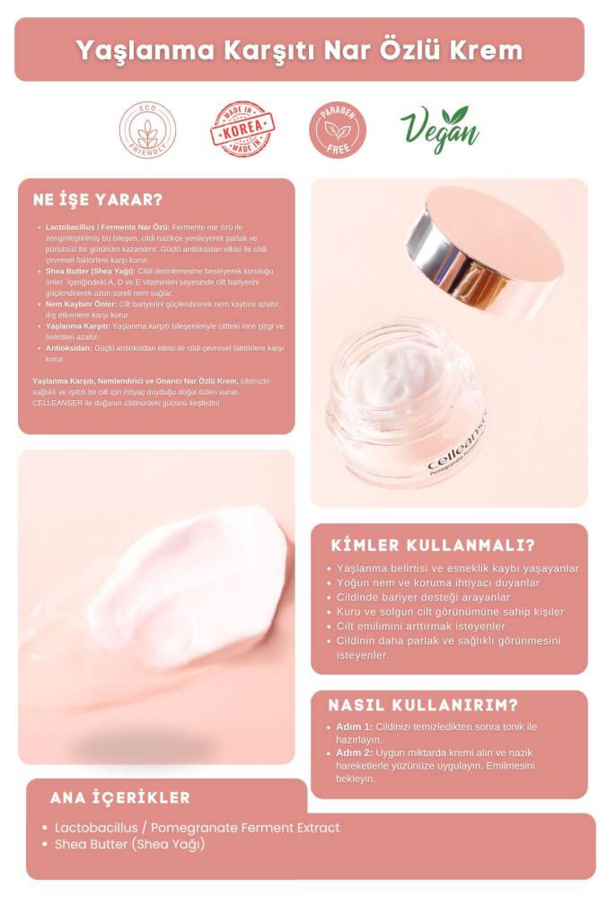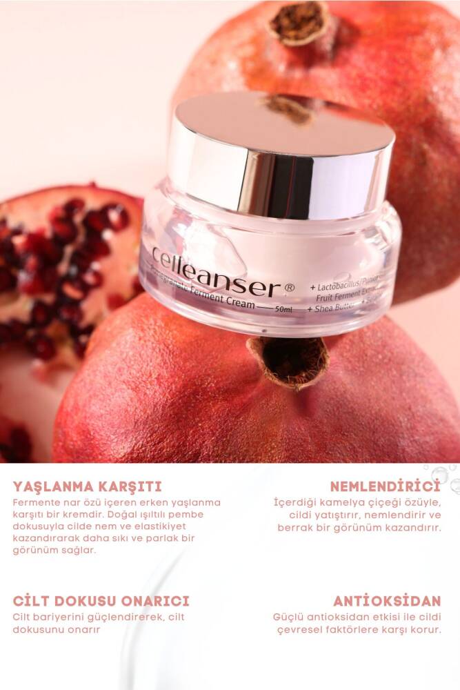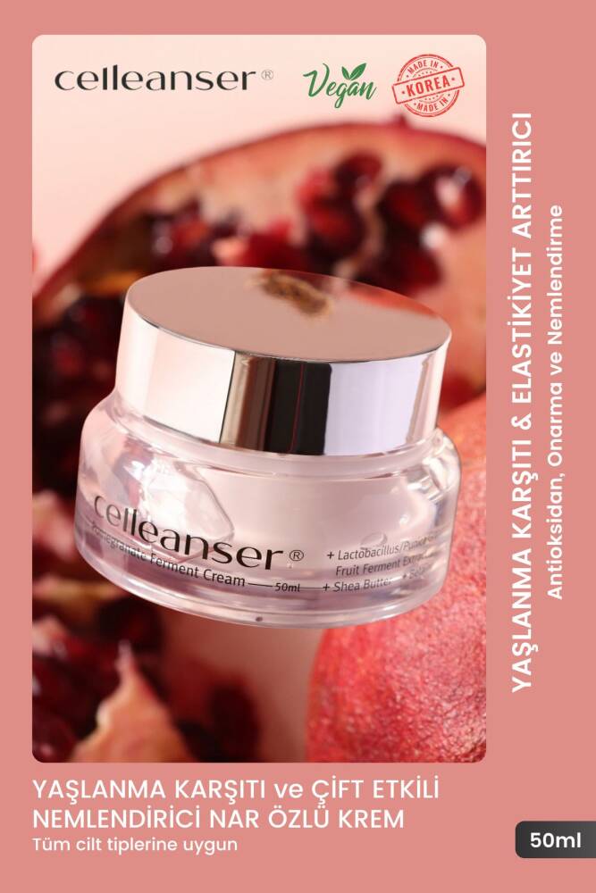 Yaşlanma Karşıtı, Nemlendirici ve Onarıcı Nar Özlü Krem, cildinizin sağlıklı ve ışıltılı bir cilt için ihtiyaç duyduğu doğal özleri sunar. CELLEANSER ile doğanın cildinizdeki gücünü keşfedin!