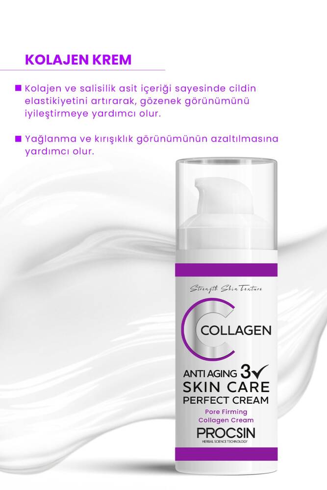 Yaşlanma Karşıtı Kolajen Krem Nedir?;Yaşlanma belirtilerine yönelik vermiş olduğu bakım desteği ile cildin daha canlı ve pürüzsüz bir görünüm kazanmasına yardımcı olması için geliştirdiğimiz bir cilt bakım kremidir.;Önemli Avantajları;Gözenek sıkılaştırıcı etki;Yaşlanma karşıtı bakım;Sebum dengesi;Elastikiyet artırıcı;Kolajen destekli içerik;Yaşlanma Karşıtı Kolajen Krem Ne İşe Yarar?;Aktif kolajen ve salisilik asit içeriğinin desteği ile cildin elastikiyetinin artırılmasına yardımcı olarak gözenek görünümüne yönelik bakıma destek vermeyi amaçlamaktadır. Düzenli kullanımla cildin sebum dengesinin sağlanmasını destekleyerek aşırı yağlanmanın önlenmesine ve ince çizgi kırışıklık gibi belirtilerin görünümünün azaltılmasına yardımcı olmayı hedeflemektedir. Düzenli kullanımla cildin çevresel koşulların olumsuz etkilerine karşı korunmasına yardımcı olabilmektedir.;Yaşlanma Karşıtı Kolajen Krem Nasıl Kullanılır?;Temiz cilde günde 2 kez parmak uçlarınızla masaj yaparak uygulayabilirsiniz. Tüm cilt tipleri için yüz ve boyun bölgesine kullanım sağlayabilirsiniz.;Ürün İçeriği ;Aqua(Water), Ethylhexyl Palmitate, Cyclopentasiloxane, Glyceryl Stearate, PEG-100 Stearate, Cetearyl Alcohol, Glycerin, Propylene Glycol, Phenoxyethanol, Dimethicone, Dimethicone/Vinyl Dimethicone Crosspolymer, Soluble Collagen, Parfum, Carbomer, Triethanolamine, Caprylyl Glycol, Salicylic Acid.